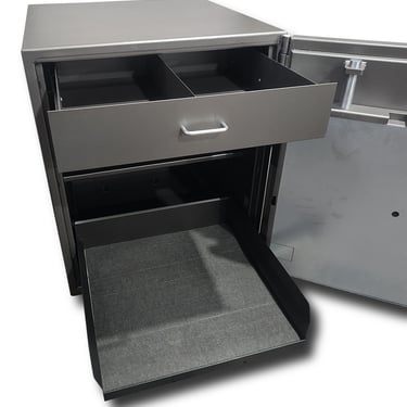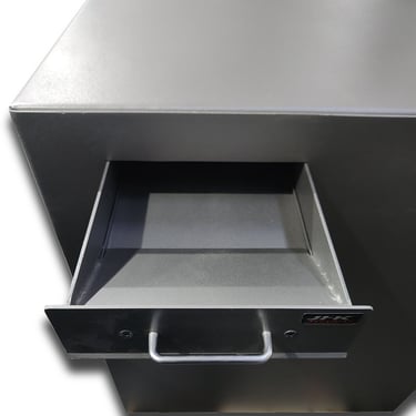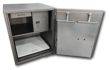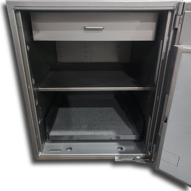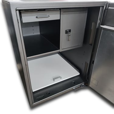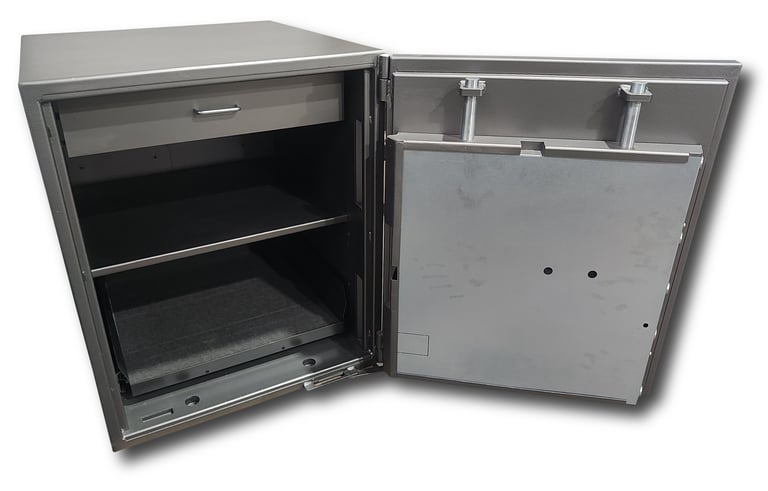Caja fuerte, la caja consta de un estante fijo, un cajón y un estante con corredera reforzada para que sea mas cómodo el guardar cosas debajo.
