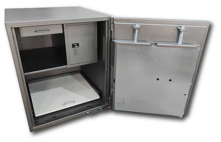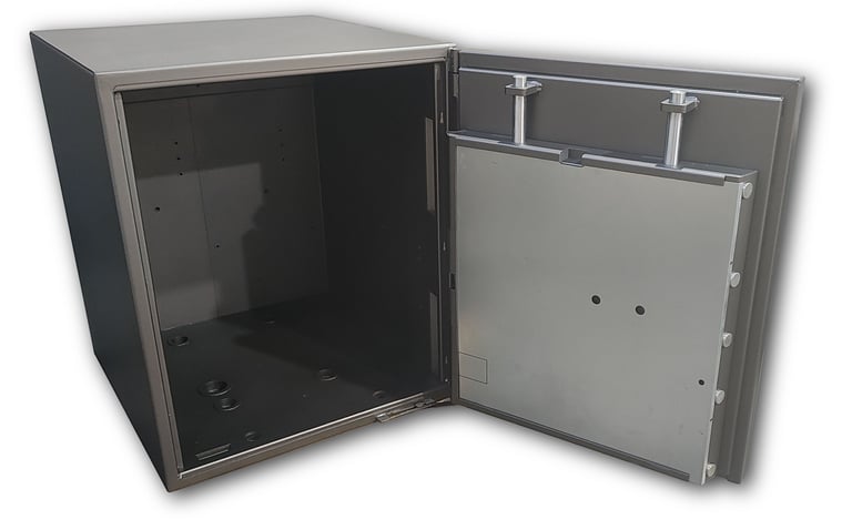 La caja tiene un nivel de seguridad grado IV pesando aproximadamente 680 kg, posee un secreto mecánico y otro electronico con retardo de apertura para evitar el robo a mano armada, esto significa que puede programarle un retardo de hasta 99 minutos, usted coloca la clave y empieza el conteo con el tiempo programado, solo cuando se cumpla ese tiempo usted vuelve a ingresar la clave para abrirla.